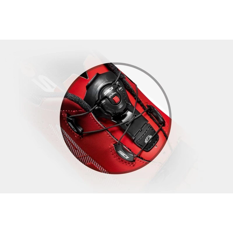 TECNO-4 PUSH SYSTEM è un innovativo sistema di chiusura costituito da un singolo rotore che garantisce una chiusura micrometrica e precisa. oltre che andare a ridurre il peso della scarpa. Il meccanismo centrale crea un perfetto equilibrio di tensione tra la parte interna ed esterna della scarpa oltre ad avere una velocità del rilascio della tensione ulteriormente sviluppato. La chiusura simmetrica è perfetta per ogni tipo di collo del piede. Un innovativo pulsante aggiunto al rotore, se premuto, fa alzare la leva così da agevolare la regolazione.